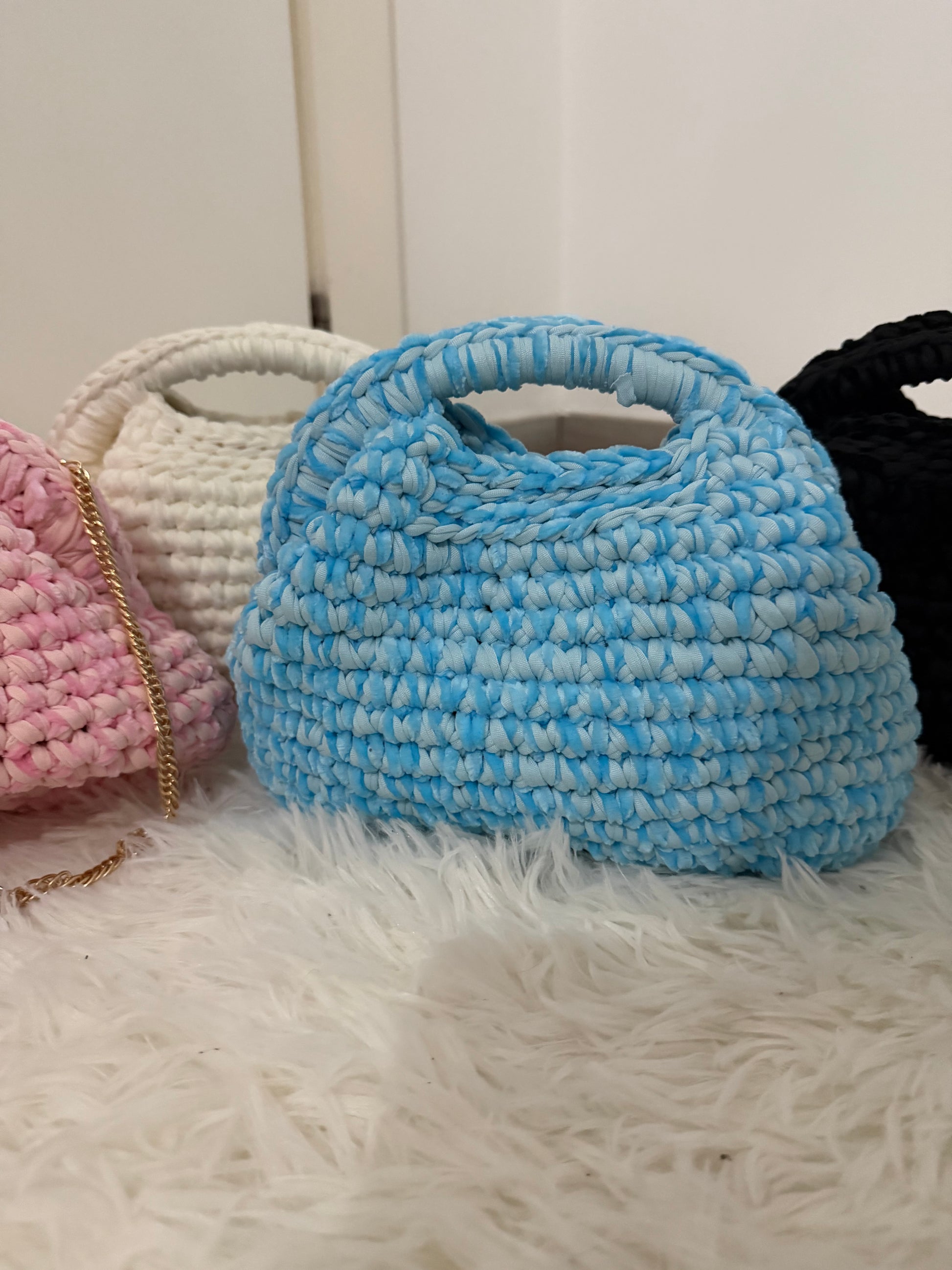 Borsa fatta completamente a mano con filo in velluto. Presente internamente anche tracolla removibile