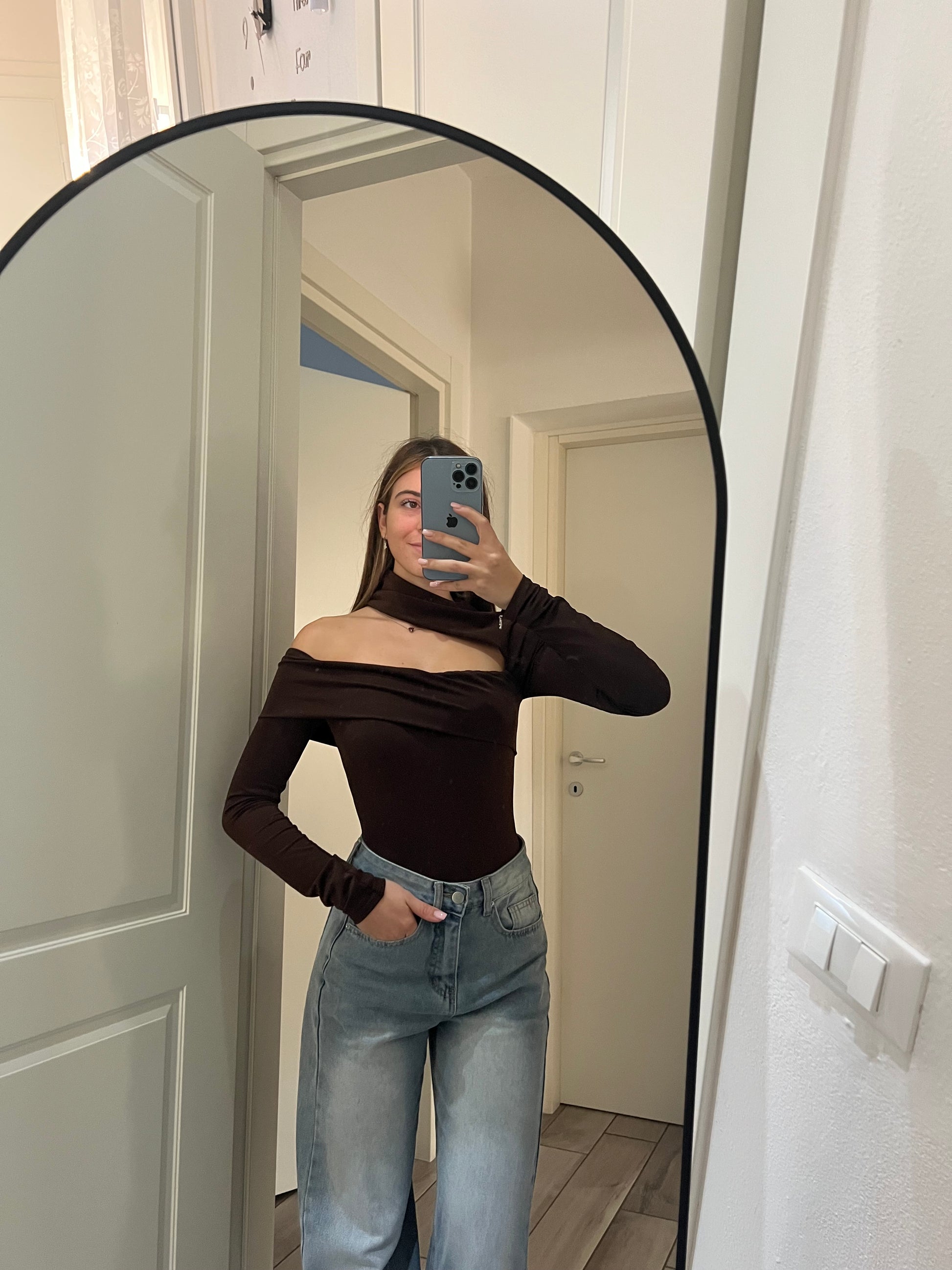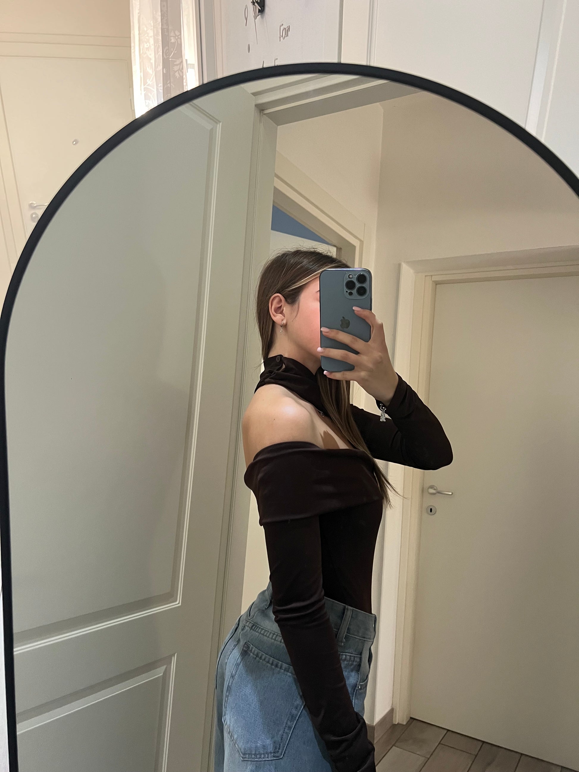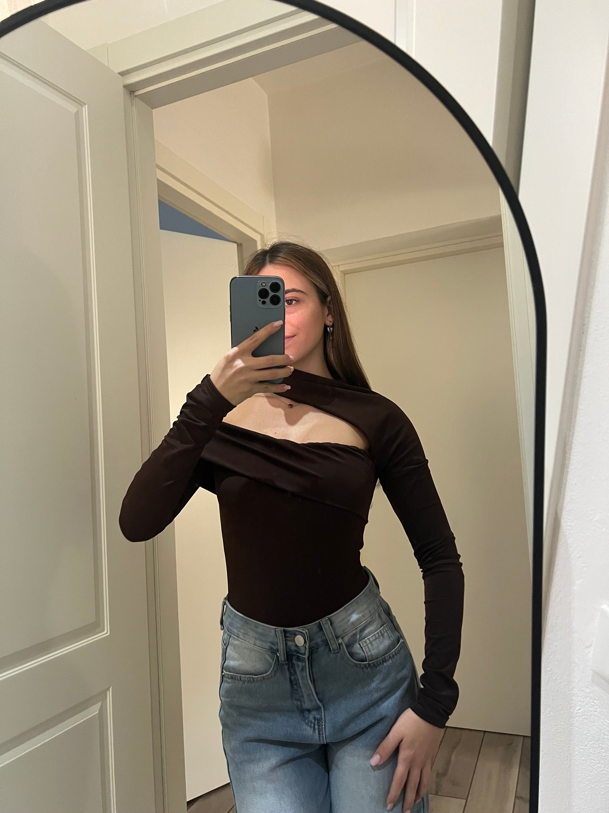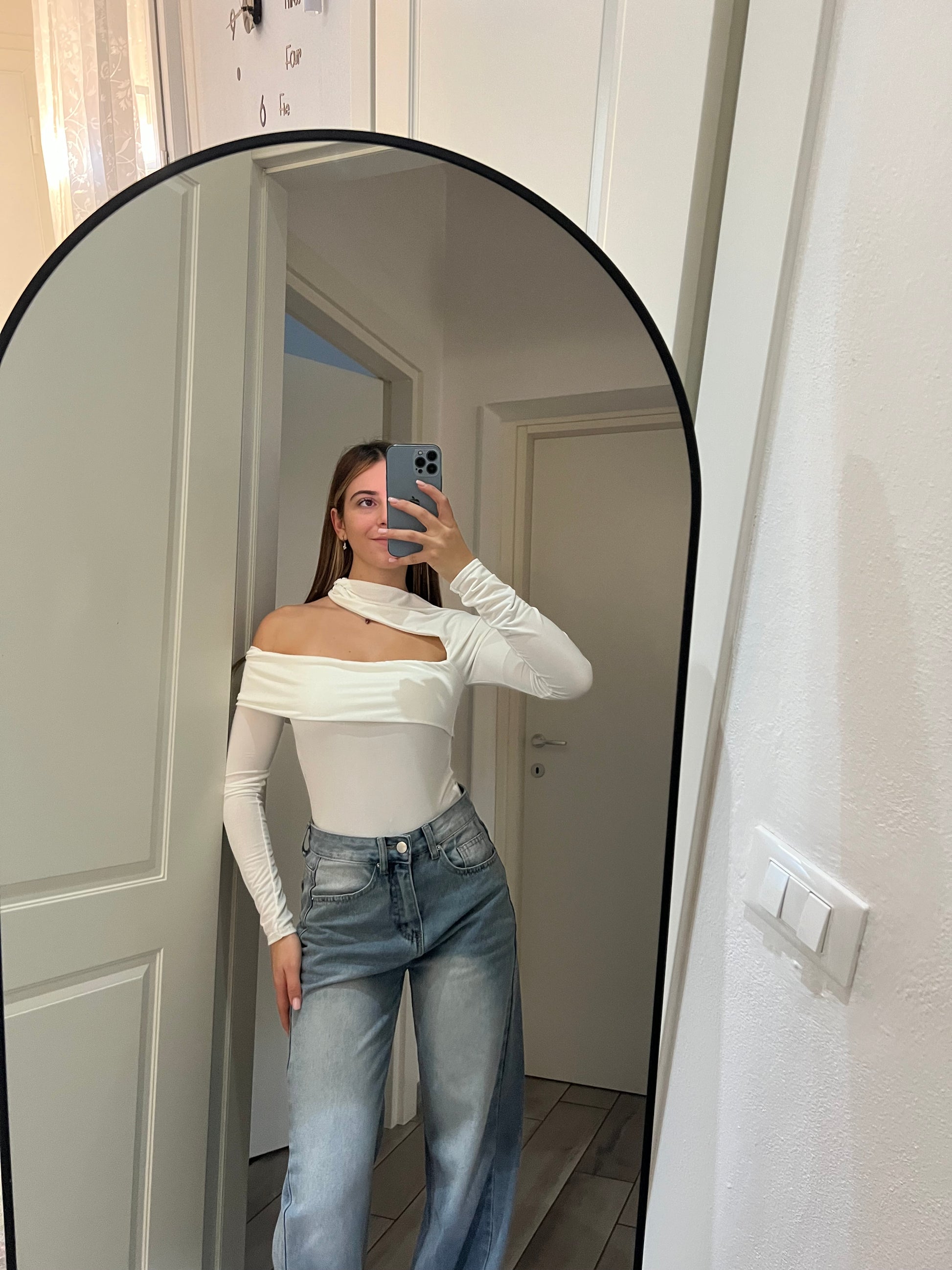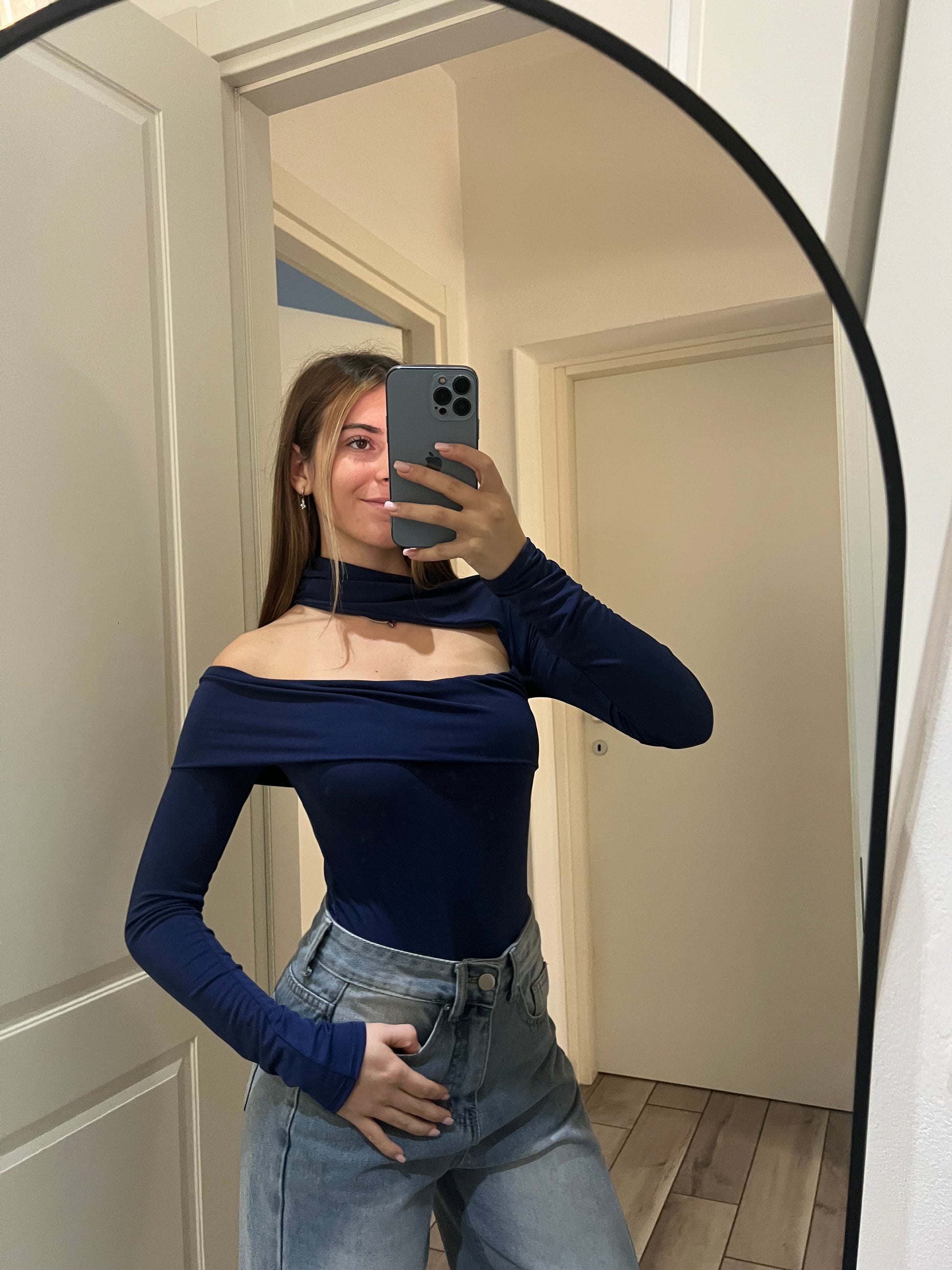Body asimmetrico con spalla sinistra scoperta. Con 3 bottoncini sul lato sinistro del collo. Molto elastico. Veste da xs a m. 96% poliestere 4%elastan