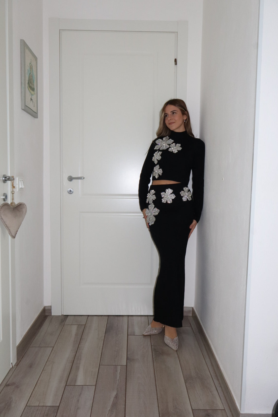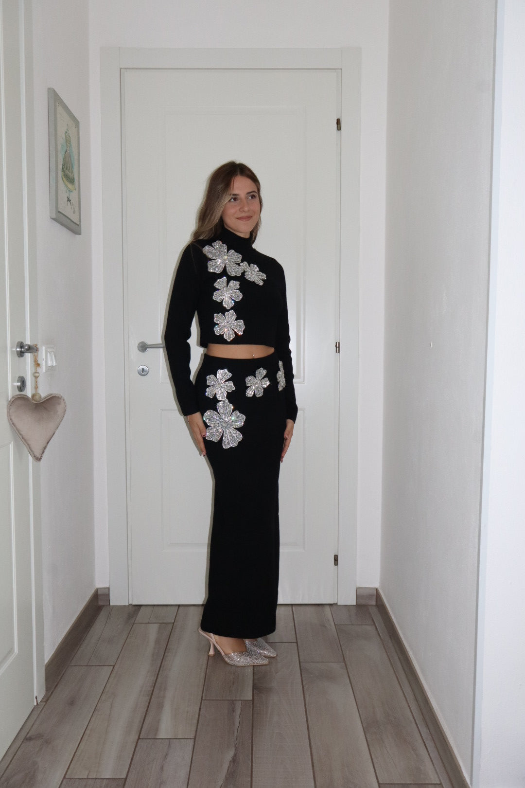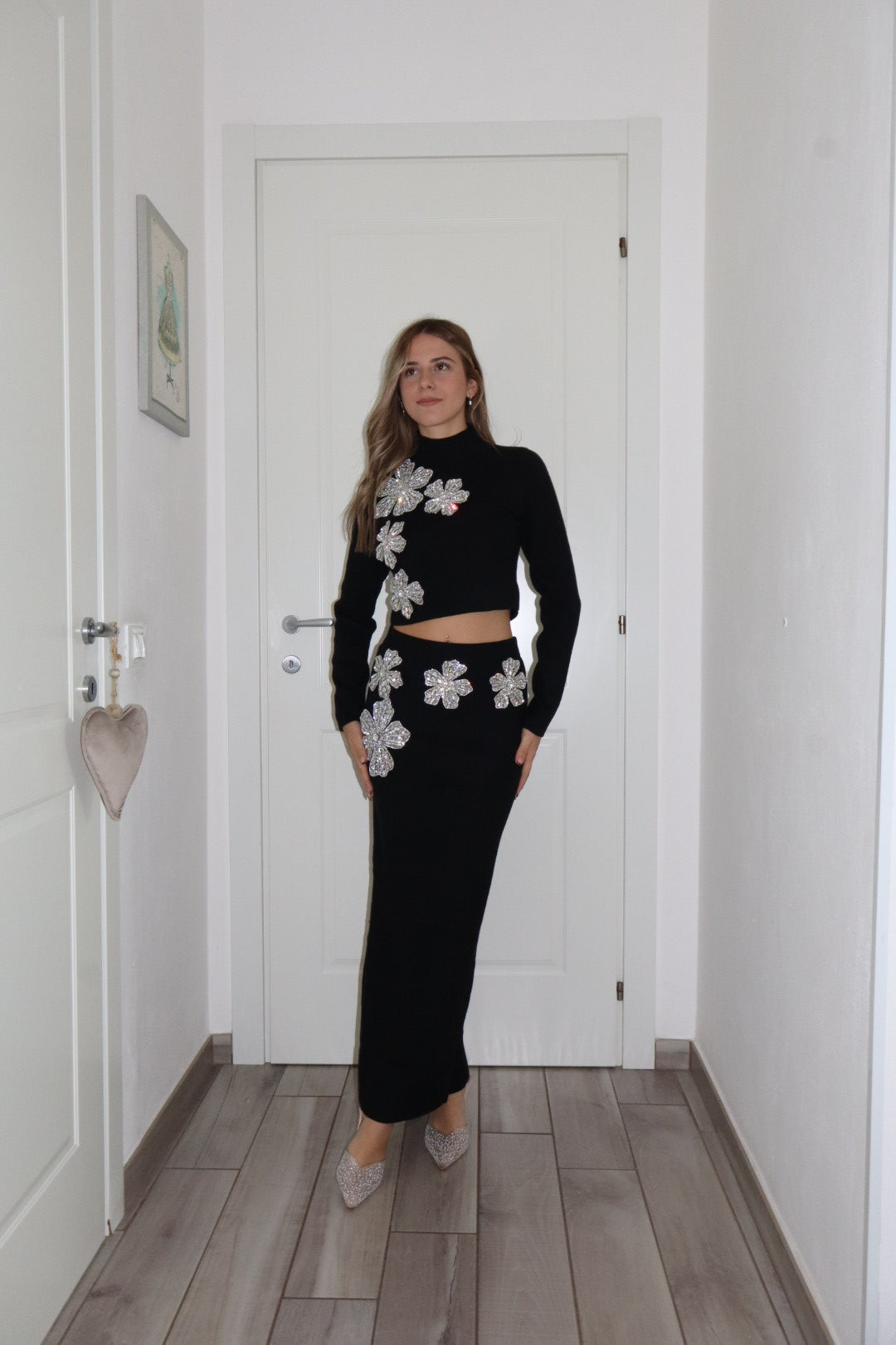 Completo in 47% viscosa e 50% poliamide ed elastan. morbido con top e gonna fasciante con fiori in strass cuciti. Tiene molto caldo e pesante.