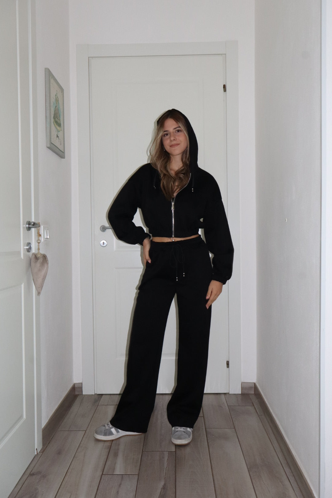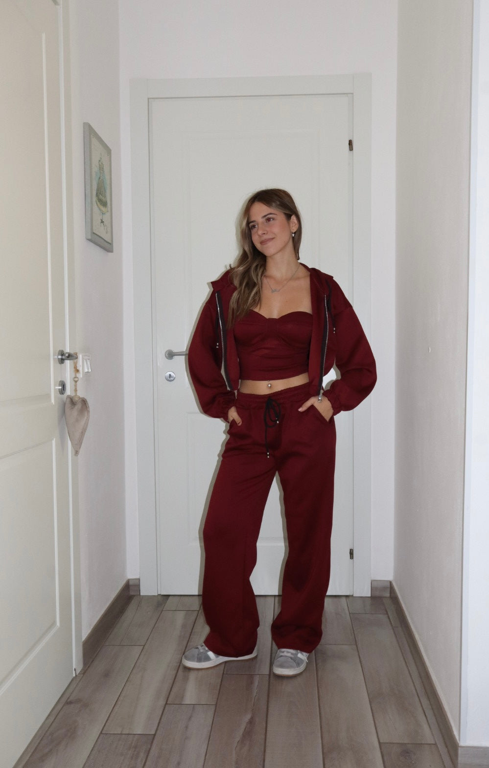 Completo con futa,felpa con zip e cappuccio e corsetto con zip e coppe. Molto morbido e felpato. Regolabile il pantalone con lacci. Modella alta 1,66cm
