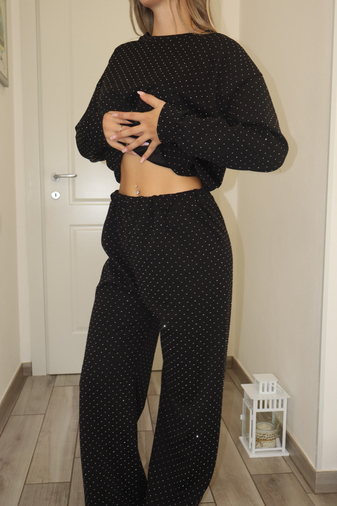 Tuta completa con felpa e pantalone brillantinati,molto elastico il pantalone con banda asticizzata. Veste da xs a L.