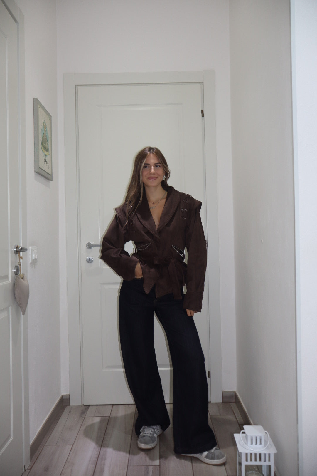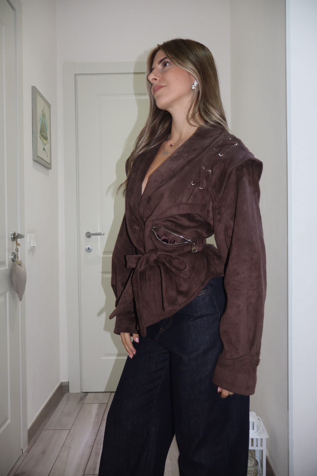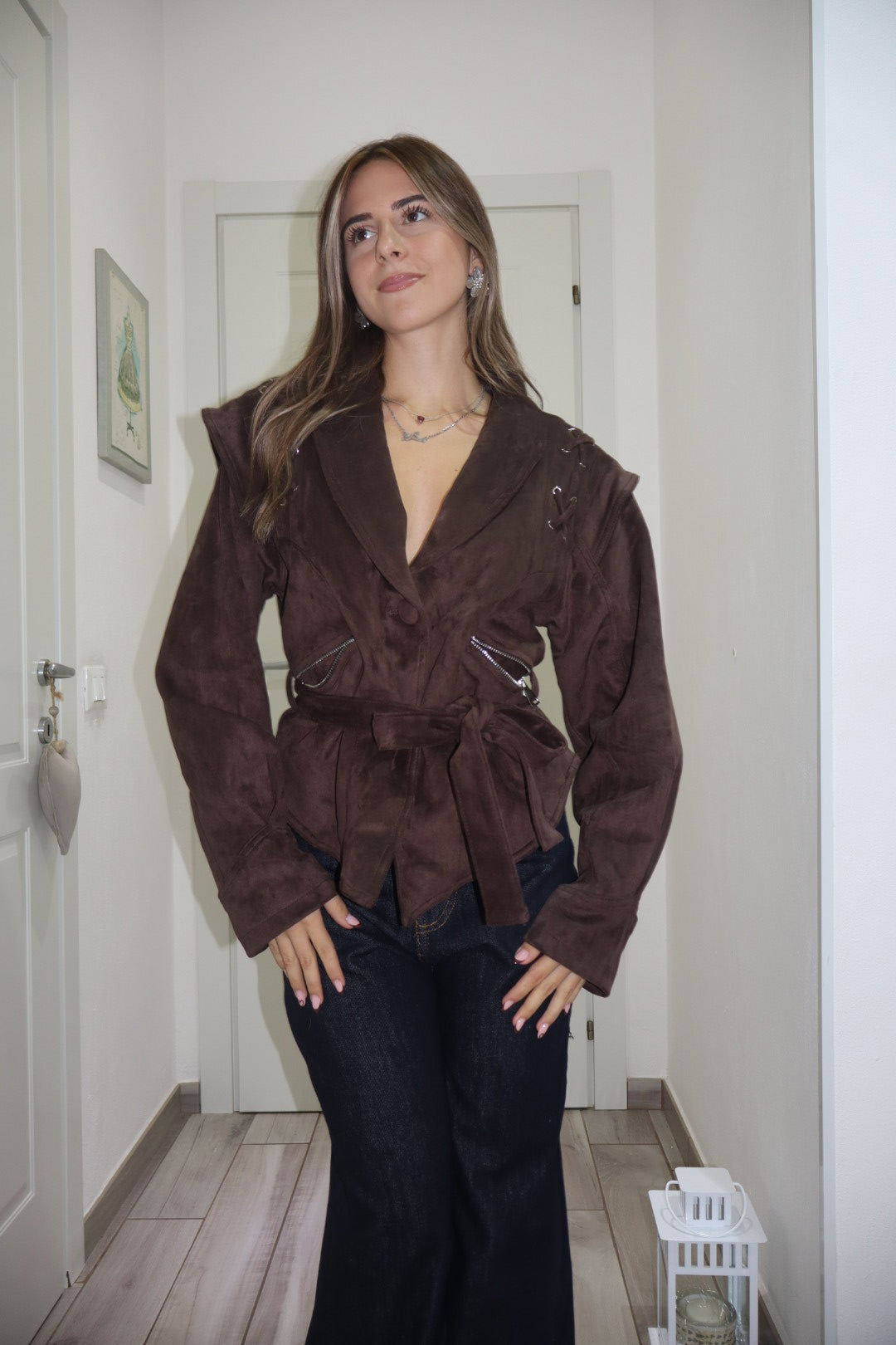 Giacca scamosciata super morbida con lacci incrociati e tasche con zip e cinturino. Interno foderato.