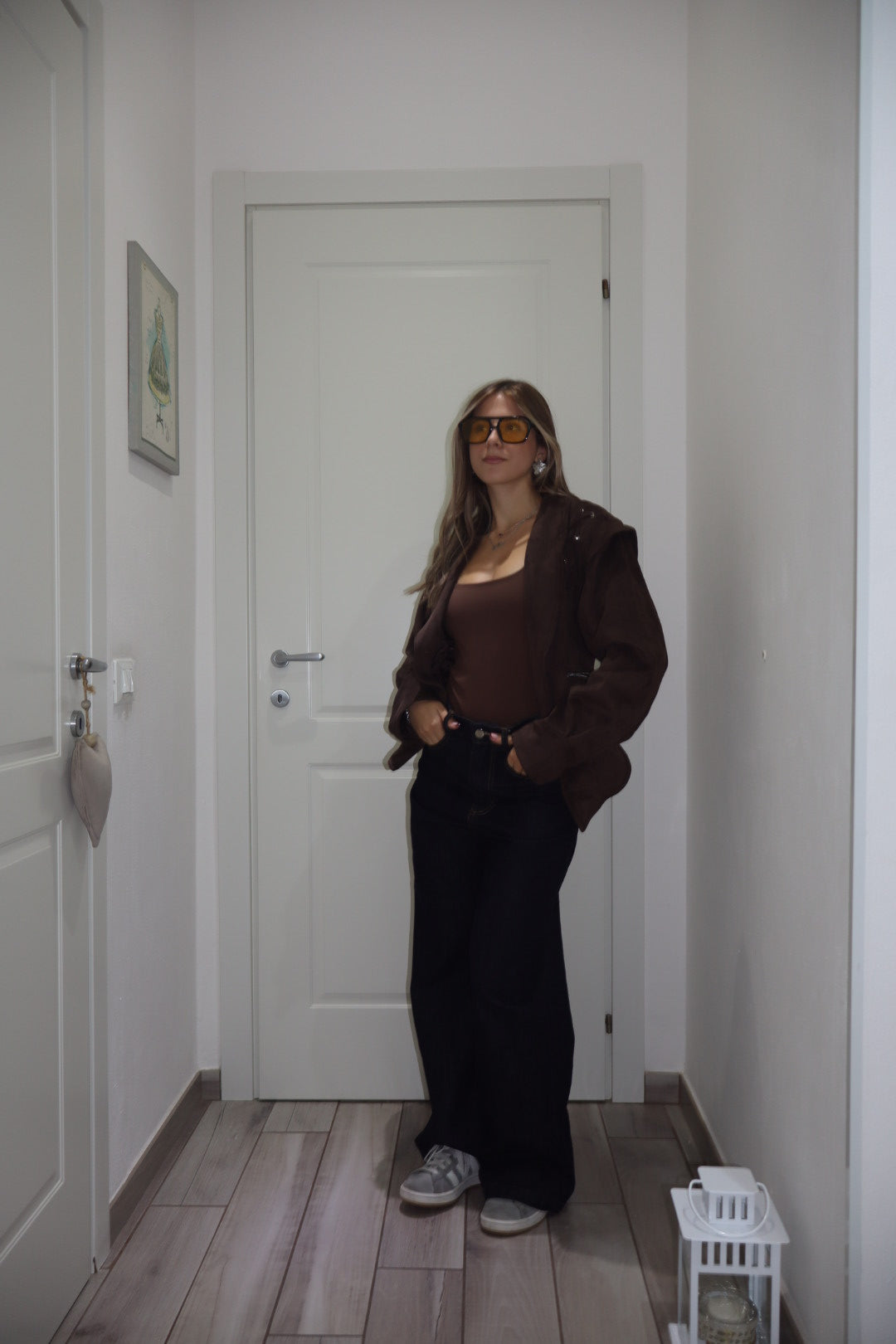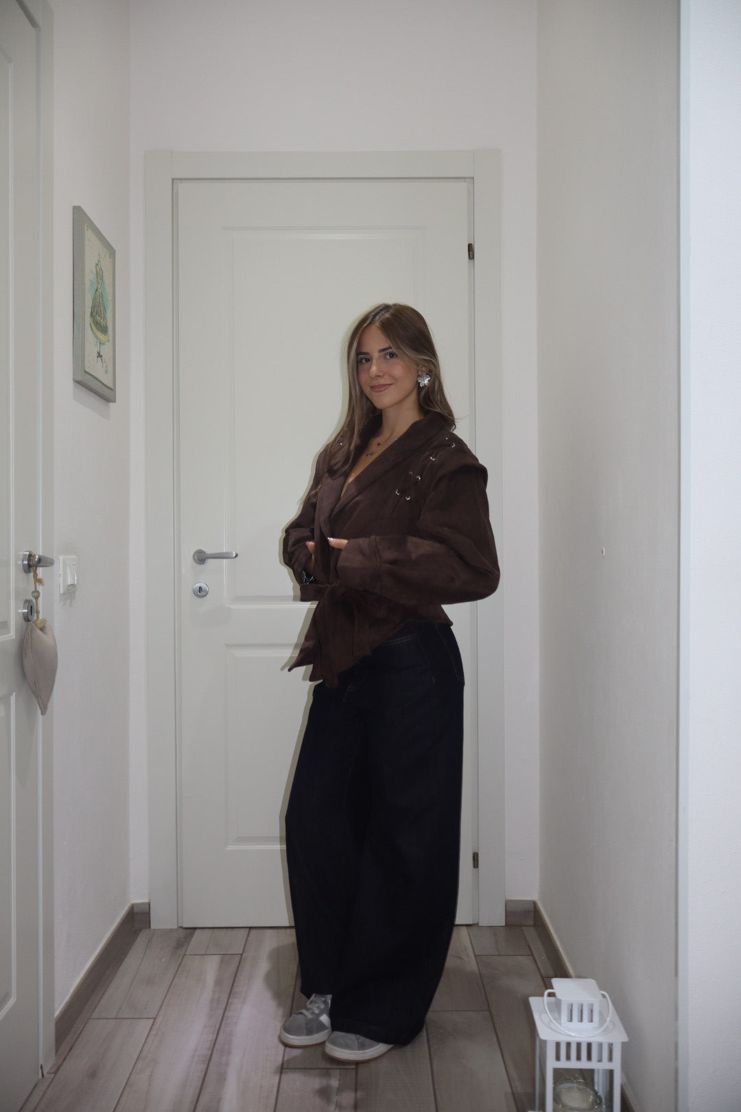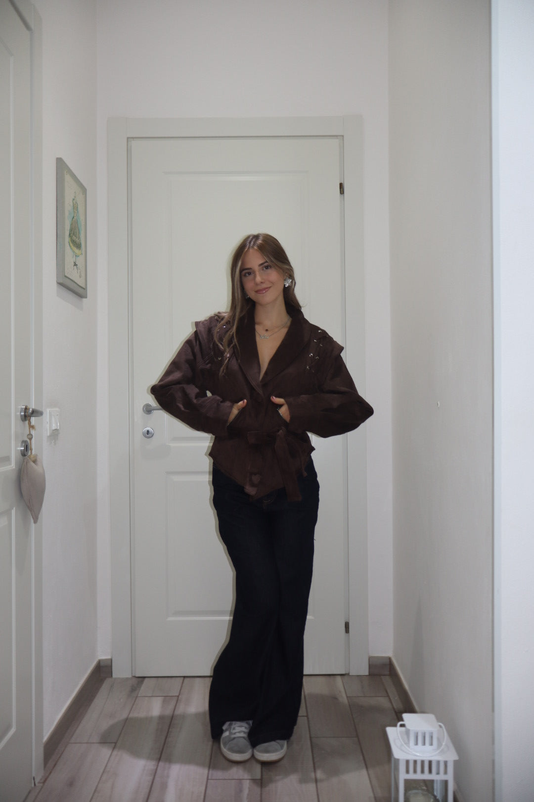 Giacca scamosciata super morbida con lacci incrociati e tasche con zip e cinturino. Interno foderato.