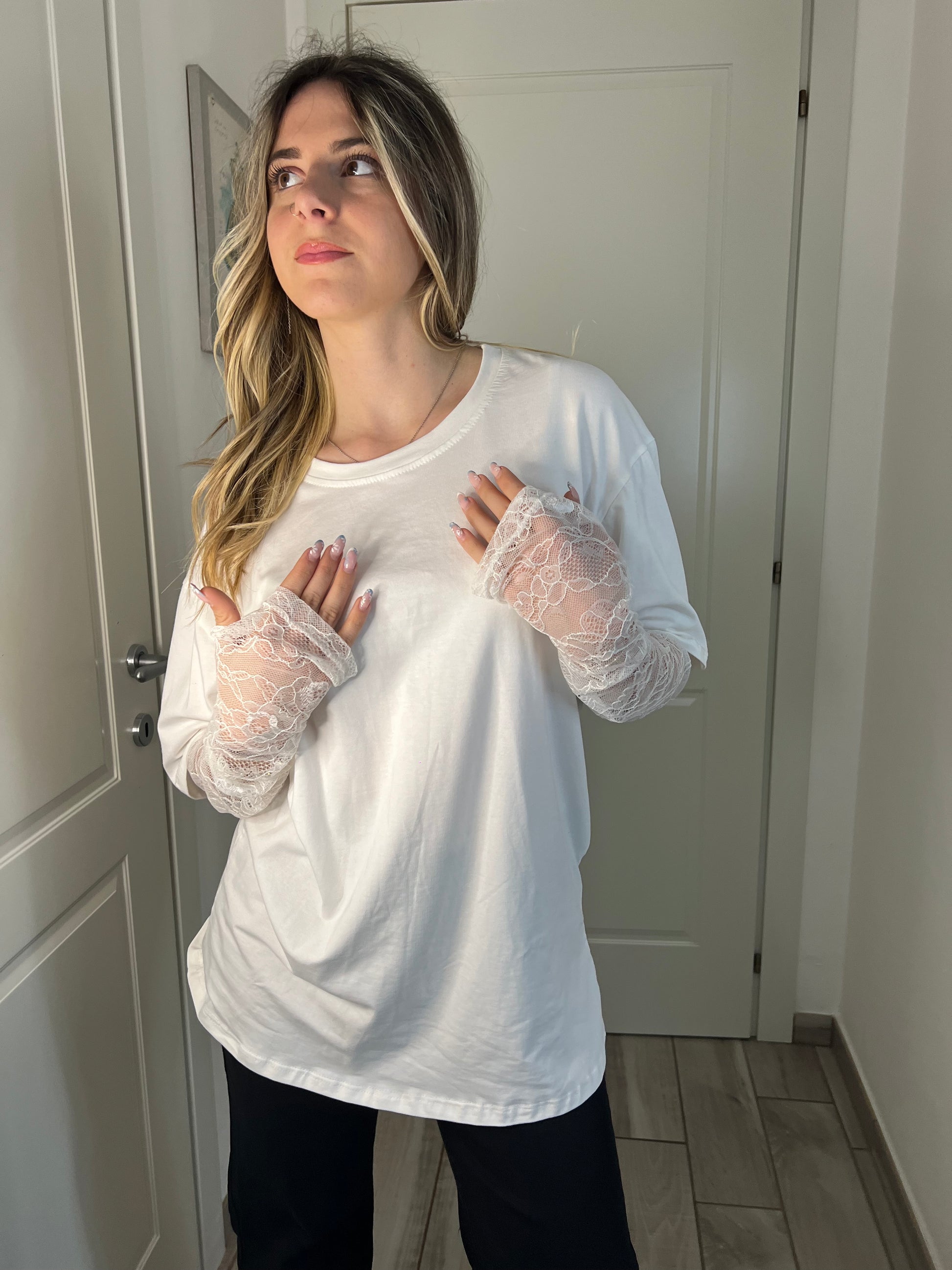 Maglia bianca con maniche in pizzo,cotone morbito, Veste da XS a L